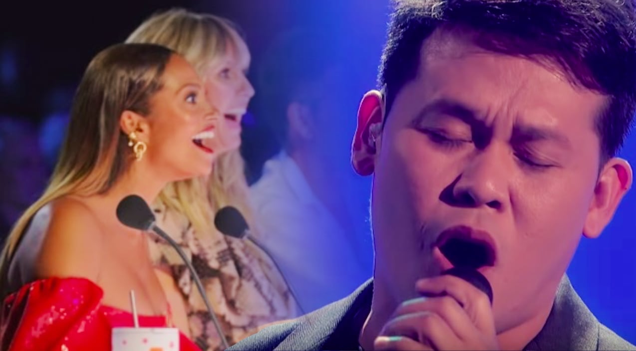 Marcelito pomoy performing 'the prayer' with signature dual voices, drawing a standing ovation from america's got talent: