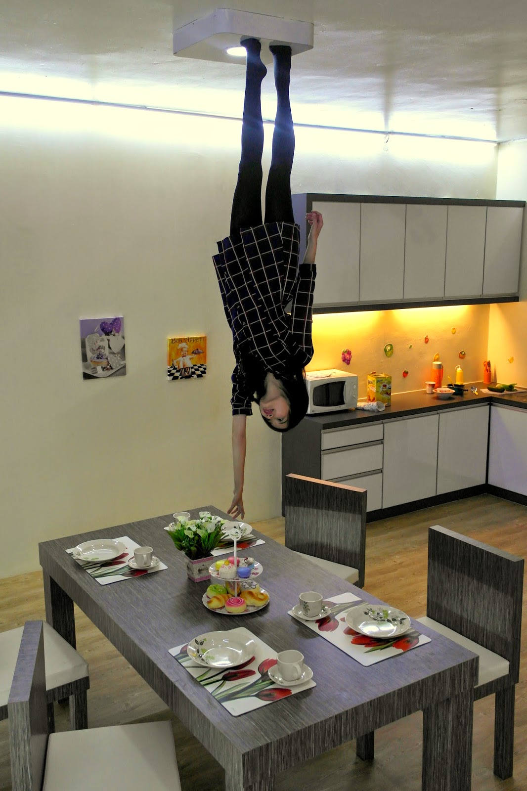 All the furniture inside, etc which would normally be on the floor, is now above your head.